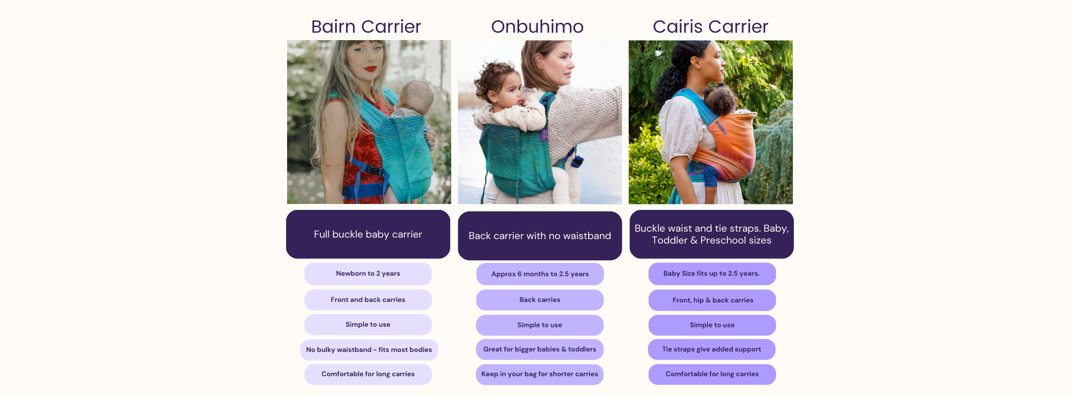 Our customer favourite - the Cairis has tie straps and a buckle waist, or choose the simple full buckle, Bairn Carrier. You can also find the Onbuhimo, which is an option for back carrying older babies.