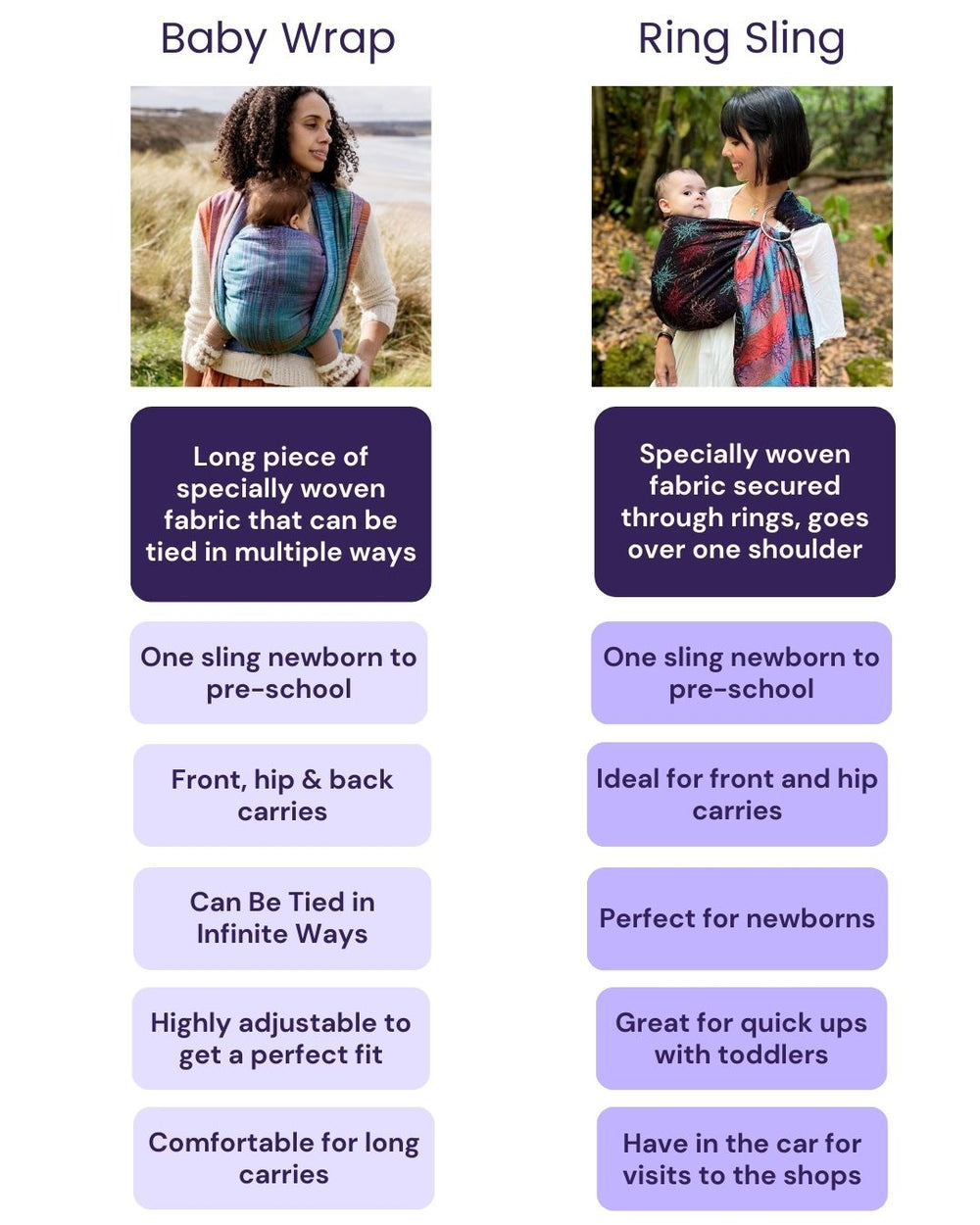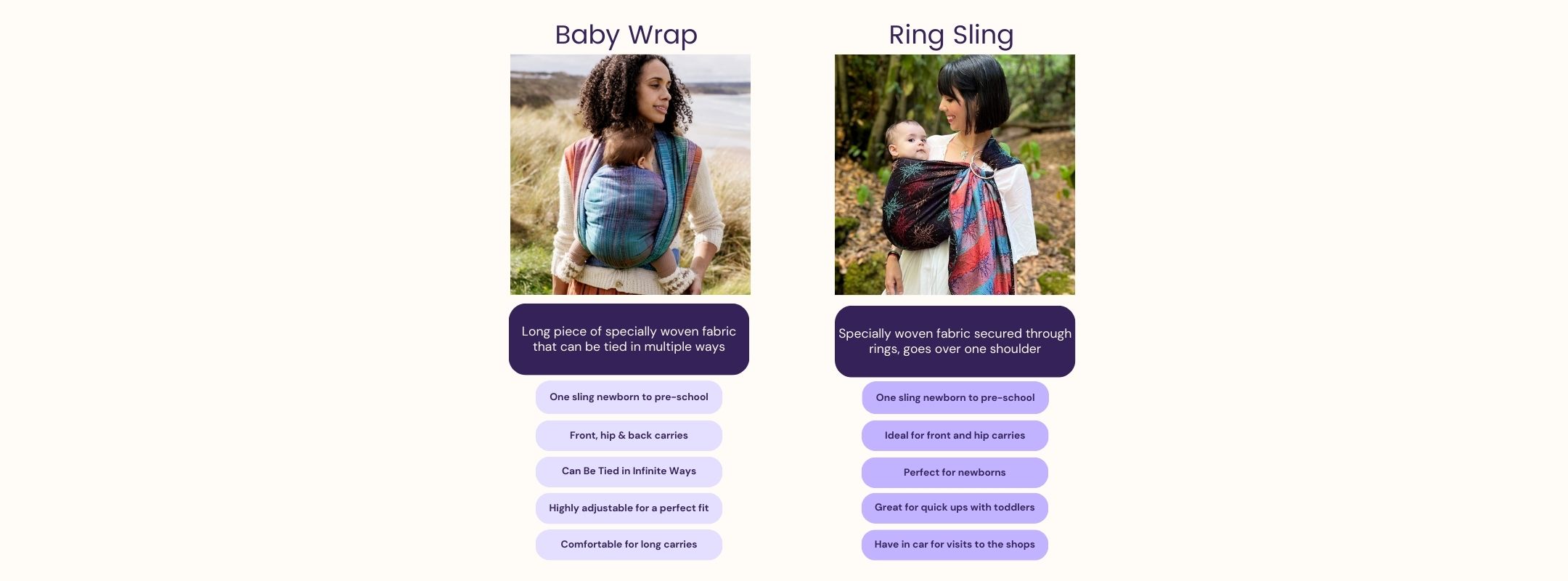 Here you can find a simple tutorial for each type of sling - woven wraps, ring slings and the Cairis Carrier. To learn more ways to use a woven wrap visit the Learn to Wrap page.