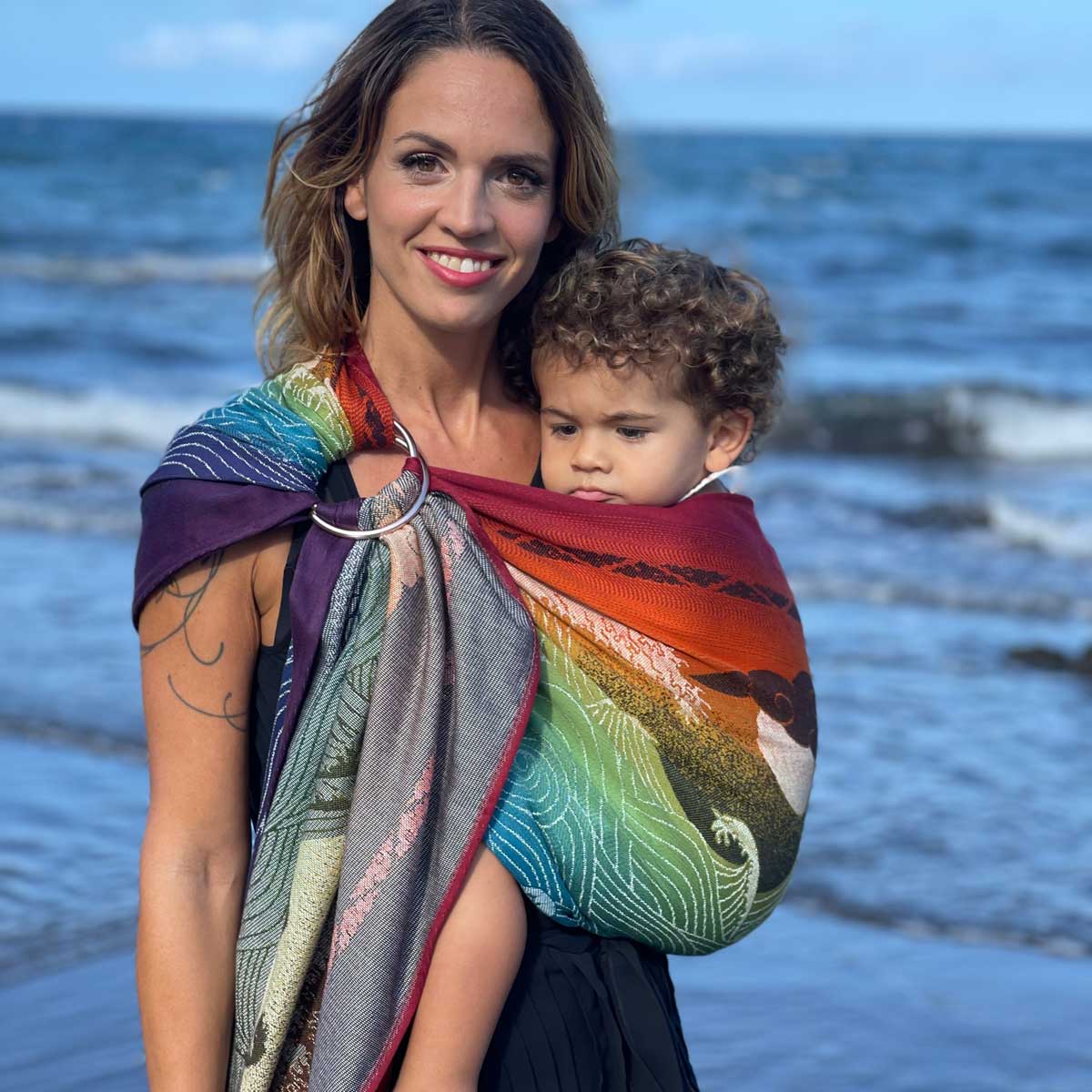 Oscha Ring slings are crafted from our specially woven sling fabric and feature unique hand drawn designs. The sling is secured on the shoulder through a set of safety tested rings. Comfortable, and quick to use, they have a low learning curve and are ideal for children who like to be up and down often.