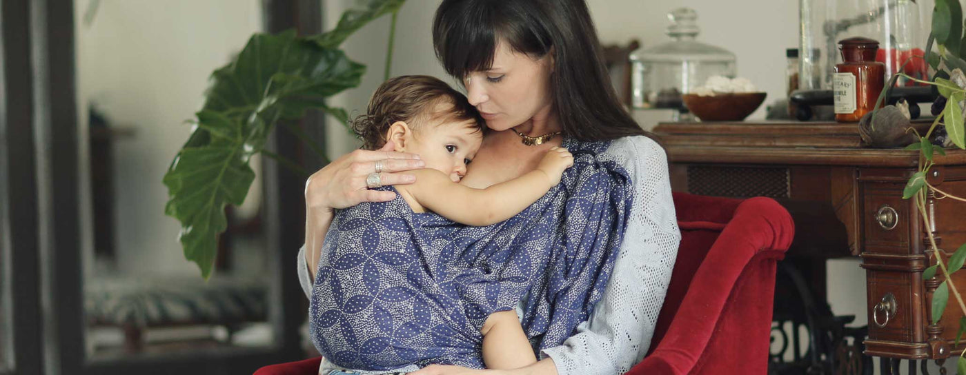 A baby sling or carrier is merely an aid when breastfeeding; you must always use one hand to support baby’s head. Never use the sling fabric to support your baby’s head; they must be able to latch off and on freely.