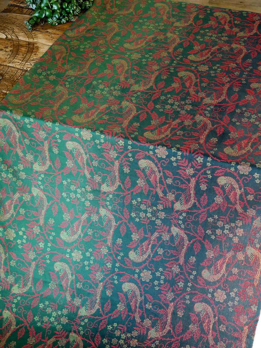 The beautiful Briarwood pattern comes to life here in all its intricately stylised beauty. Set against a deep fade of dark green hues in the warp, the design is picked out in red bamboo viscose and gold Italian wetspun linen. The bamboo lends a gentle shine and smooth, silky touch, while the wetspun linen adds strength, crisp definition, and a subtle golden glow.