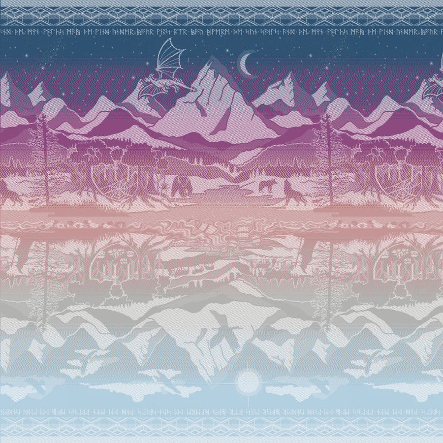 The extraordinary adventures of Bilbo and the dwarves across Middle-earth are featured in this stunning fabric which showcases the extraordinary escapades of Bilbo and the dwarves running from night scenes to day.