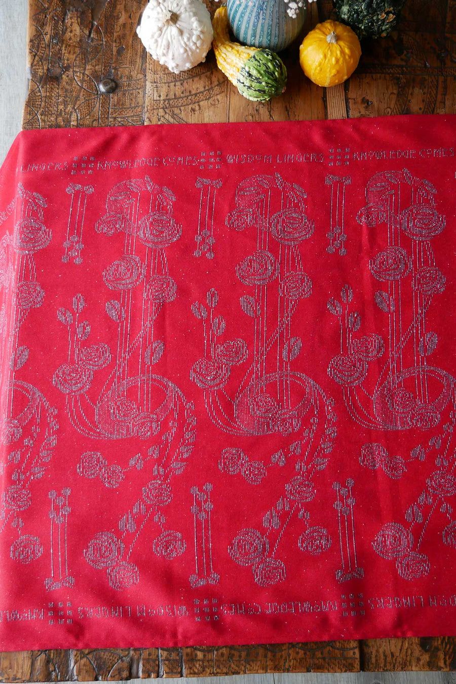 A beautiful blend of grey Bourette silk alternates with black Cashwool creating a fabric that is mouldable and soft. The beautiful Margeau pattern, inspired by the Art Nouveau designs of Charles Rennie Mackintosh, is picked out against a stunning red.