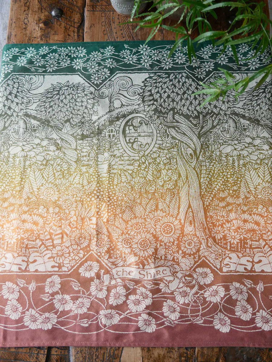 The colours of Shire Harvest Light transitions through forest greens to burnt orange tones and to earthy browns. The shades are reminiscent of the harvest season and celebrate the beauty of the Shire as the countryside begins to change seasons. The bustling Shire pattern is picked out in pale yellow, featuring the iconic circular doorway, smoke rising from a warm hearth and well-tended gardens teeming with life and activity: all of which tells the whimsical tale of the Hobbit home.