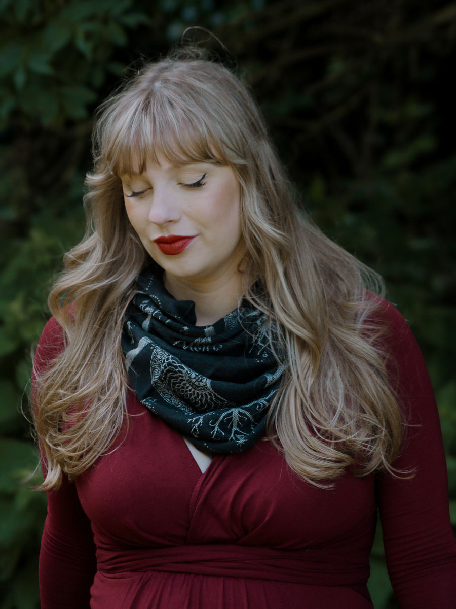 Beautiful ecru trees shine against a black background on this stunning Tolkien-inspired cowl. The trees in this pattern each represent part of the lineage of the White Trees. The original White Tree was much beloved by the Elves, it emanated silver light, and is said the Moon was formed from its last silver flower. Each tree thereafter is seen to symbolise divine qualities of goodness, wisdom and purity.