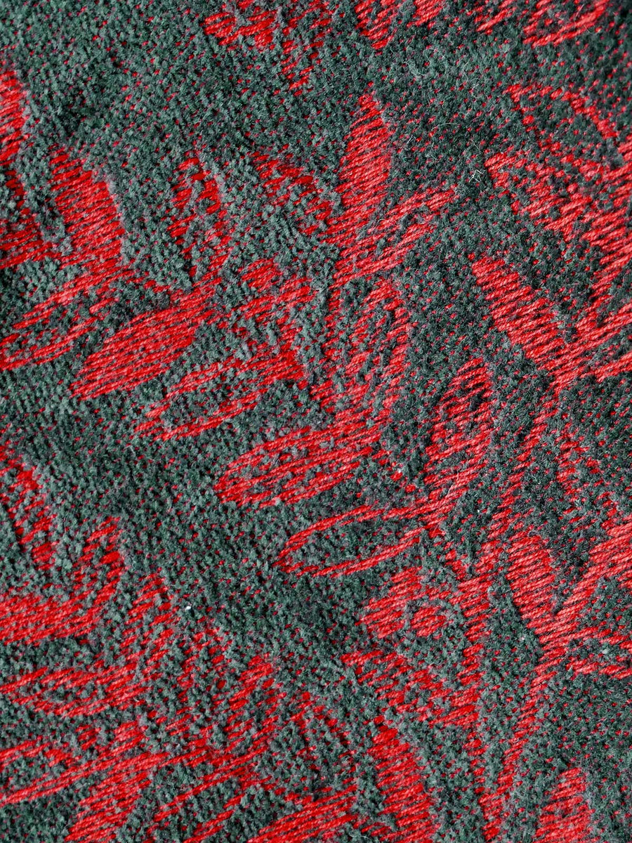 Willow Briad Sylvara is woven on a rich red warp, with a dark cotton chenille weft that brings the intricate willow pattern to life. Hemmed with the weft side out, beautiful red leaves stand out against a deep, shadowy background for an elegant, striking look. The fabric's aesthetic is reminiscent of a towel – absorbent and soft.