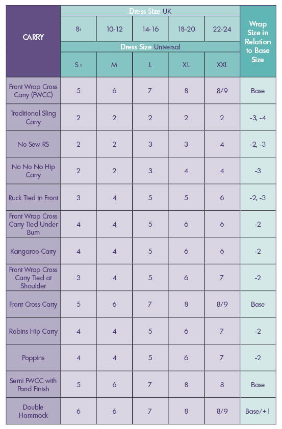 If so, choose your 'Base Size' (see chart) - this is the size needed for the carry shown in the instructions - Front Wrap Cross Carry (FWCC).